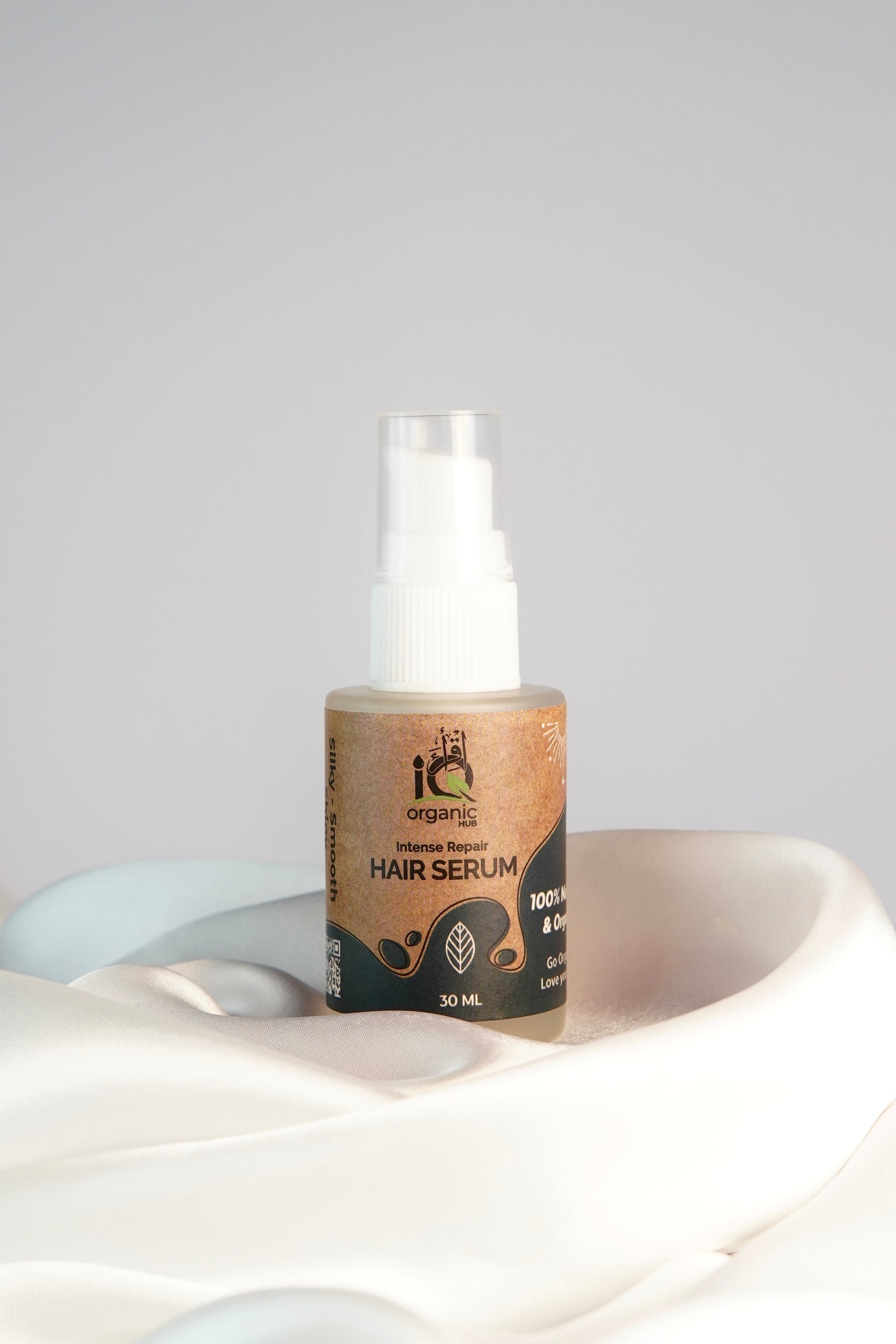 - Apply Serum: Pump a small amount of IQ Organic Hub Intense Repair Hair Serum into your palm.